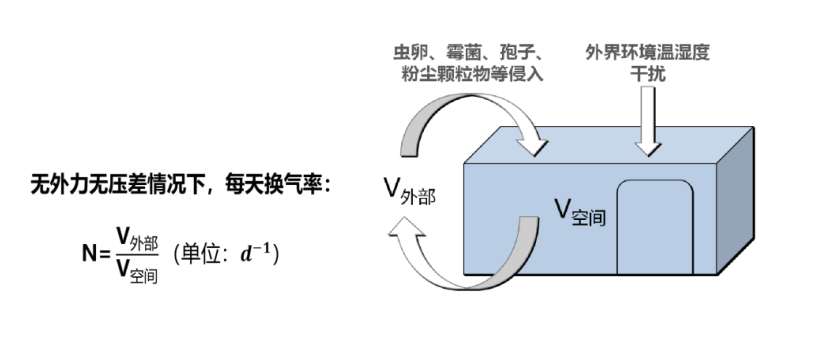 圍護結構針對館藏環境主要是以庫房儲藏柜、展柜為主,對殺蟲而言,主要是以殺蟲室和殺蟲柜為主。圍護結構的高氣密性可以阻隔大氣中灰塵、溫濕度、有害生物、氧氣和污染氣體等對微環境內藏品影響,維持微環境穩定。衡量密封性能,通常用“換氣率”來表示。