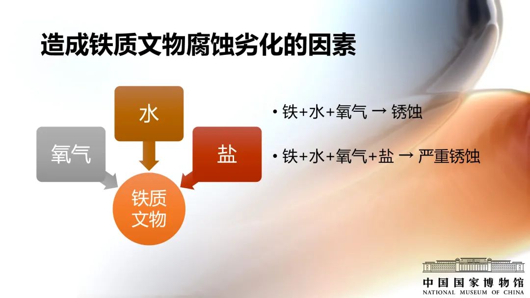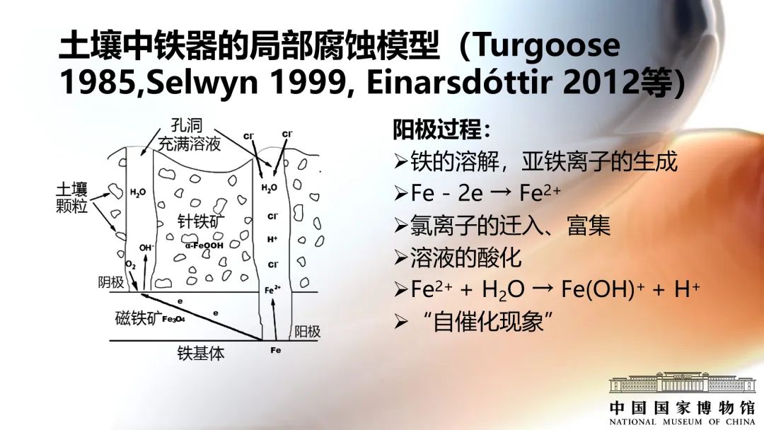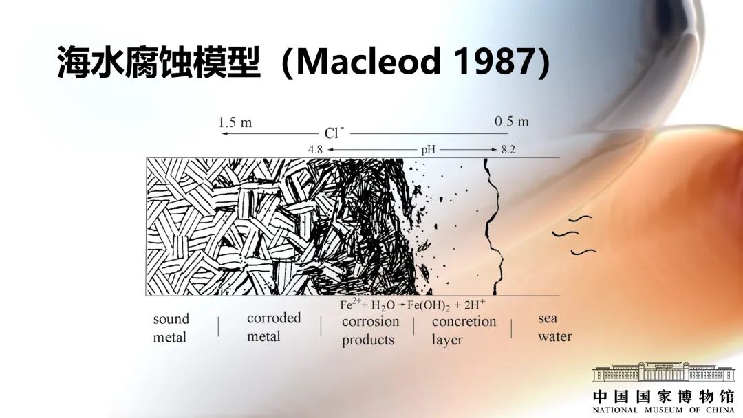 圍繞氯化物介紹鐵質文物的腐蝕劣化機理,主要分為兩個階段:埋藏階段的腐蝕和出土后的繼續腐蝕。
