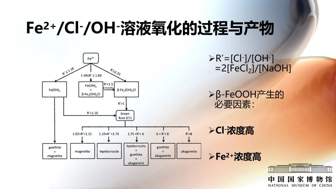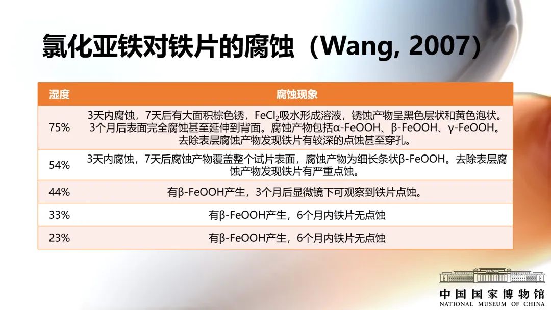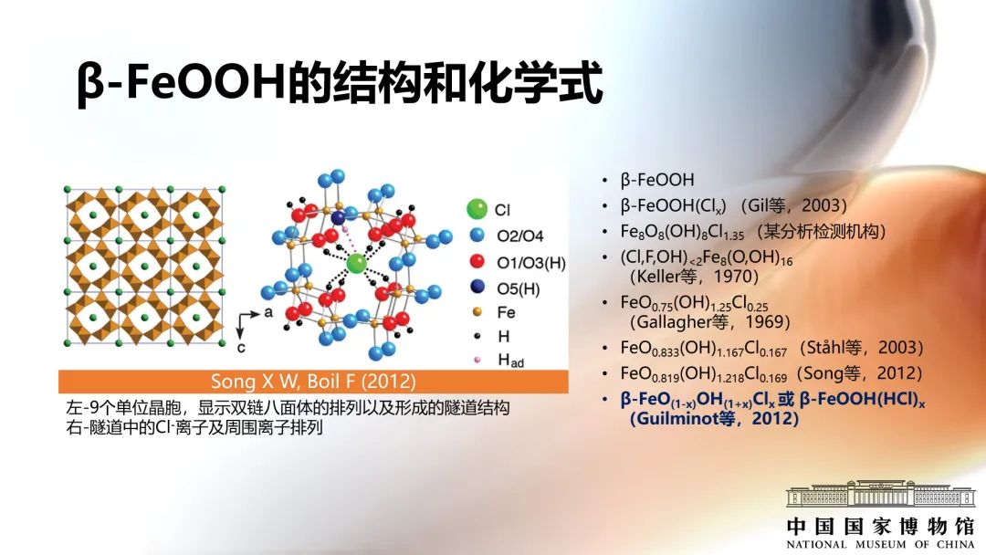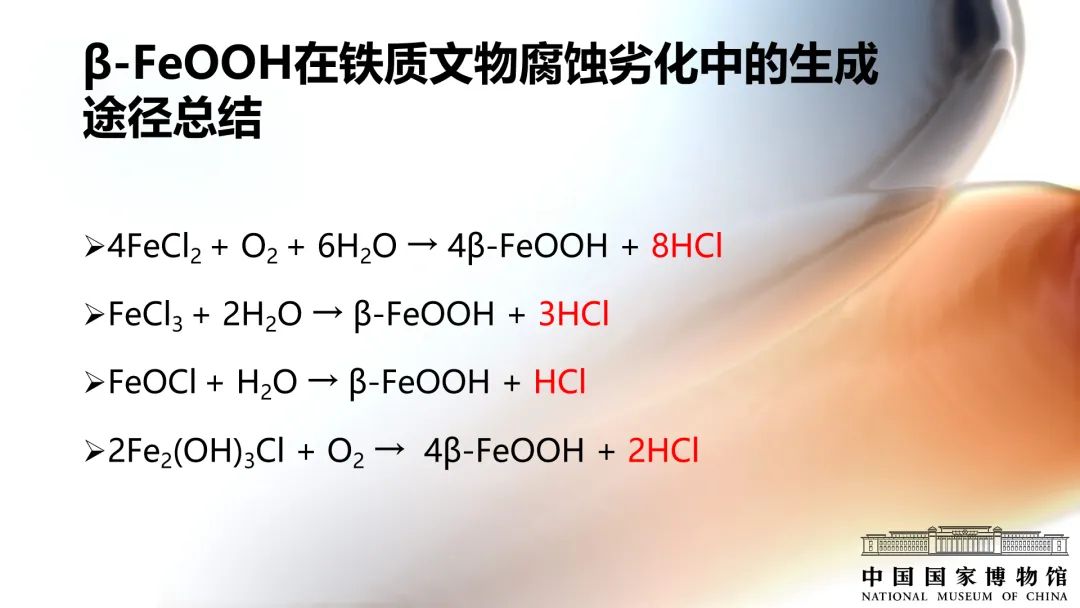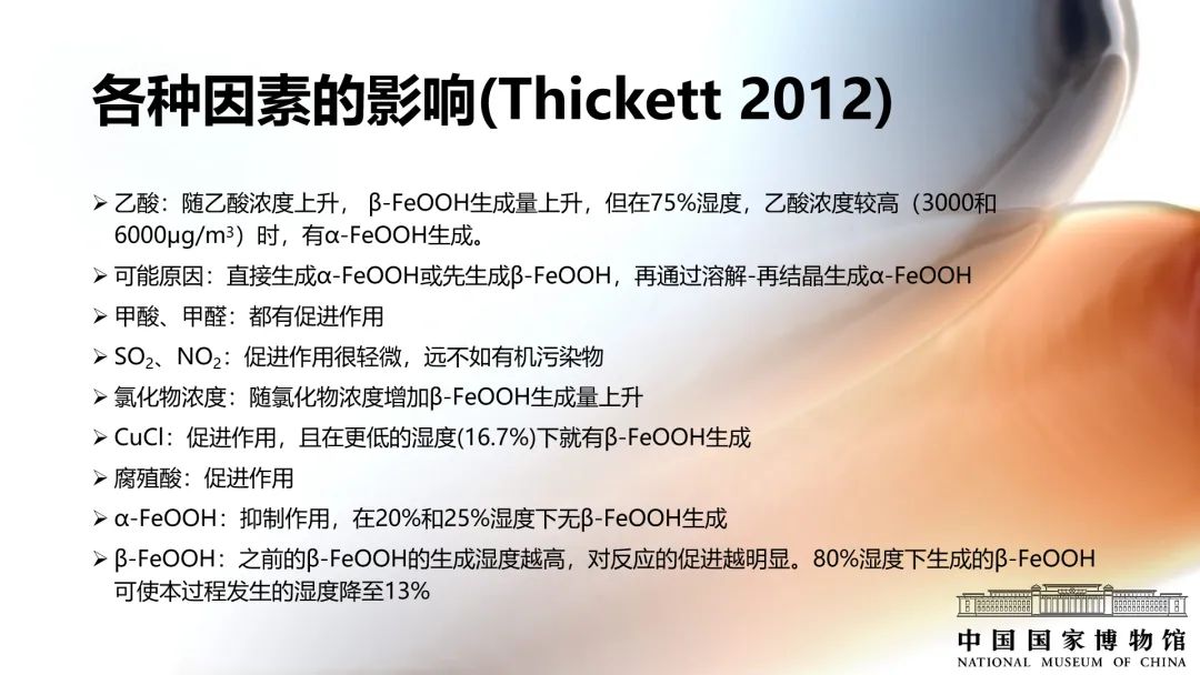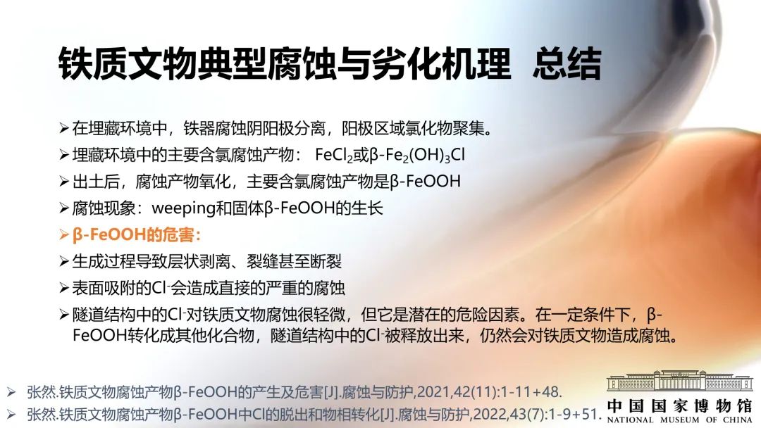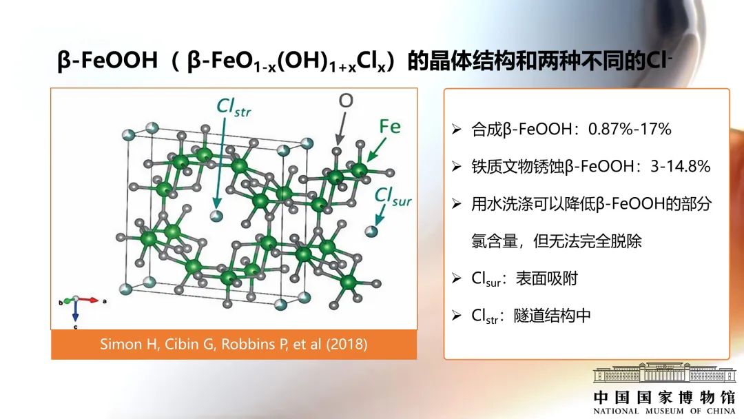 英國文化遺產機構的David Thickett調研了284件鐵質文物損壞的原因,發現其中78%的鐵質文物主要損壞原因是β-FeOOH的生長。