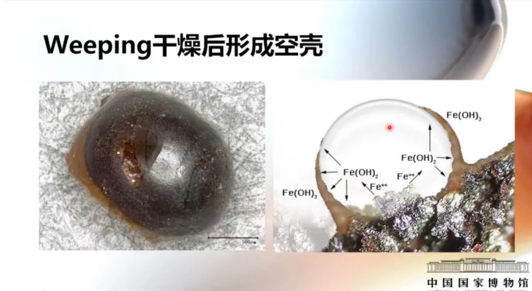 下圖是國外學者做的示意圖。液滴整體表面張力很大,所以會形成很小很圓的結構。表面氧化會生成固體的腐蝕產物,當內部的液體流失或者干燥之后,就會形成空殼狀的結構。