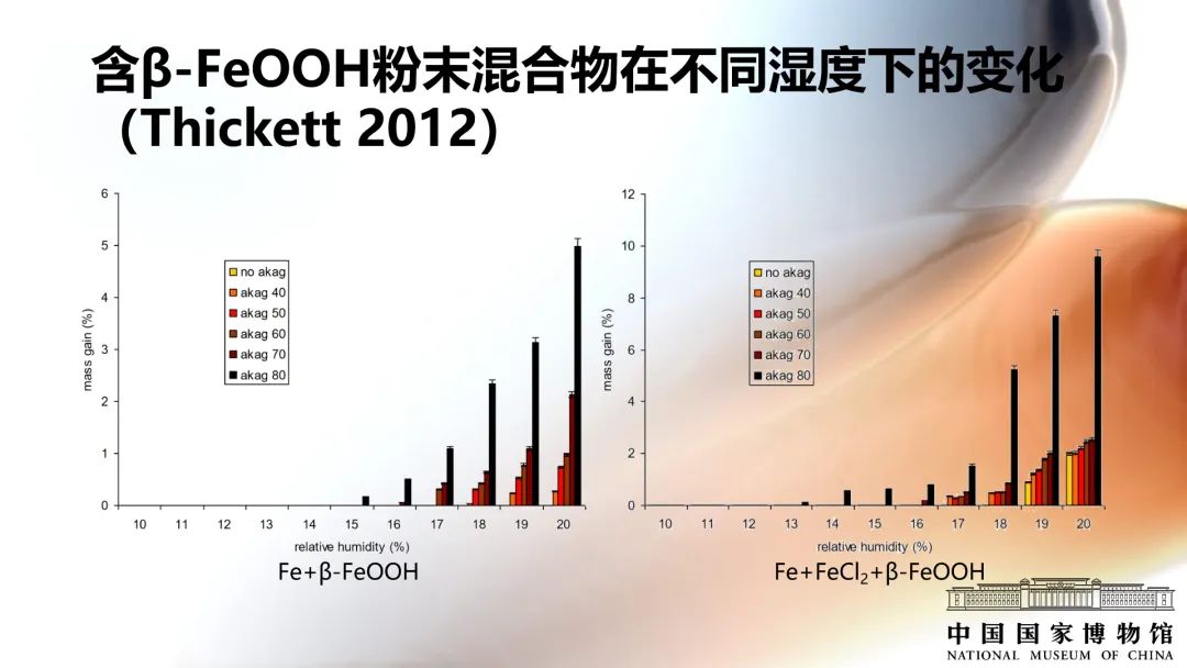 用不同濕度下生成的β-FeOOH樣品與鐵粉混合模擬出土后的鐵器。實驗發現:同等濕度下,β-FeOOH對鐵粉的腐蝕比FeCl2要更加嚴重。β-FeOOH生成的濕度越高,鐵粉腐蝕發生的濕度越低,腐蝕越厲害。在混合物里邊再加入FeCl2,鐵粉腐蝕的濕度更低,在13%的濕度下就會有質量變化。意味著鐵器出土后,所處的環境濕度越高,通過控制濕度來抑制腐蝕就越困難。