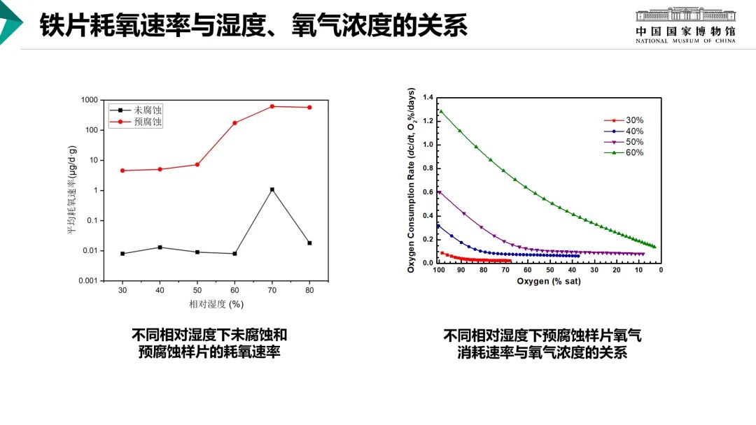 下邊左圖說明了氯化物對鐵質文物腐蝕的促進作用和濕度的影響。右圖結果表明在中低濕度下,反應速率隨著氧氣濃度的降低而降低,最終基本穩定在一個較低的水平,總體來講,濕度對于腐蝕劣化速率的影響是決定性的,高濕度的腐蝕速率是快于低濕度的。