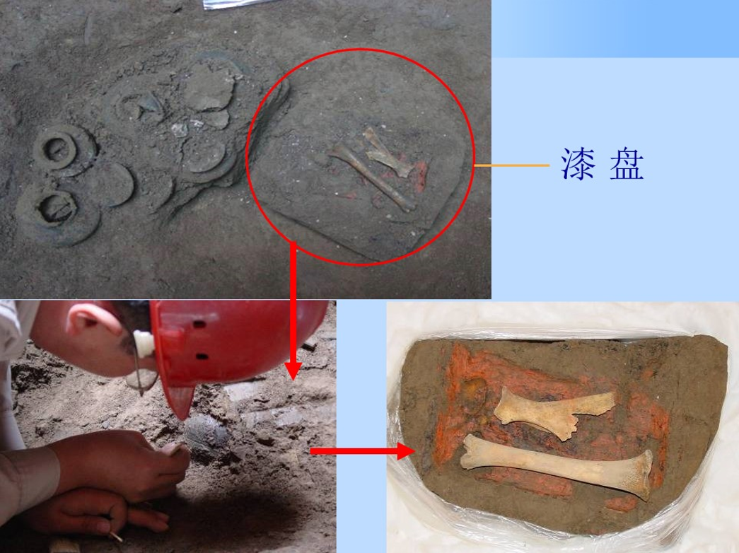 對于文物極度脆弱,沒有辦法單獨提取的情況,以我們在考古現場做的一個先秦時期的墓葬發掘為例。在這個墓葬里面出土了一個木質的漆盤,漆盤里邊還放著骨頭。