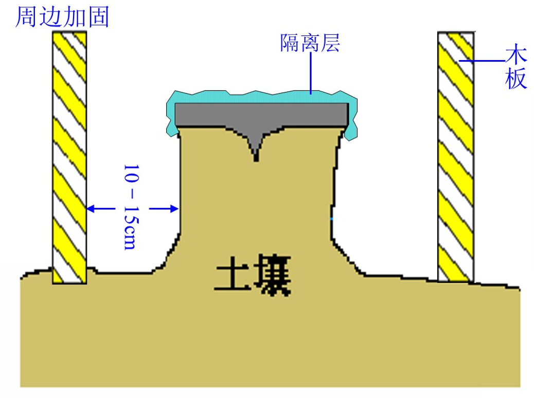 隔離處理完成后,我們做了一個木質框架,比土質臺基要寬很多。對木質框架底層進行填土處理,因為實際地面并不平整,填土可防止灌注聚氨酯液體時發生外溢。