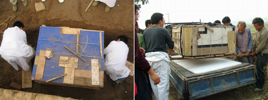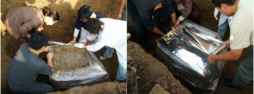 先介紹一下什么是整體提取。所謂的整體提取,簡而言之,就是把文物和包裹它的周圍包裹物一起打包搬運。