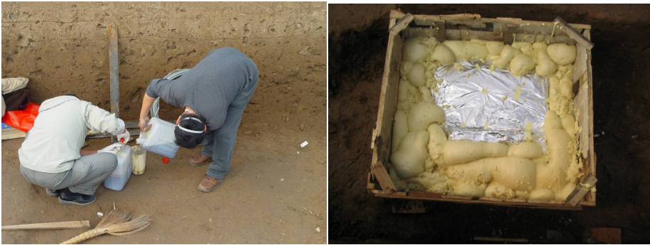 當然我們發掘現場用的聚氨酯泡沫是一種發泡型的,需要將兩種液體混合以后攪拌,攪拌完以后根據現場需要的形狀來使用。