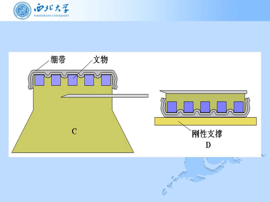 “背襯提取法”其實很簡單,就是用紗布繃帶條橫向和縱向交疊貼附在文物的上面。