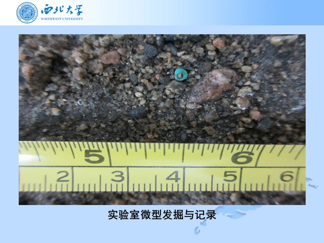 通過在實驗室做微型發掘過程的照片記錄,可以看到這是一個綠松石小珠子,就是幾毫米左右。如果在現場去做清理,光線特別不好的情況下,很有可能就把它當石頭清理掉了。