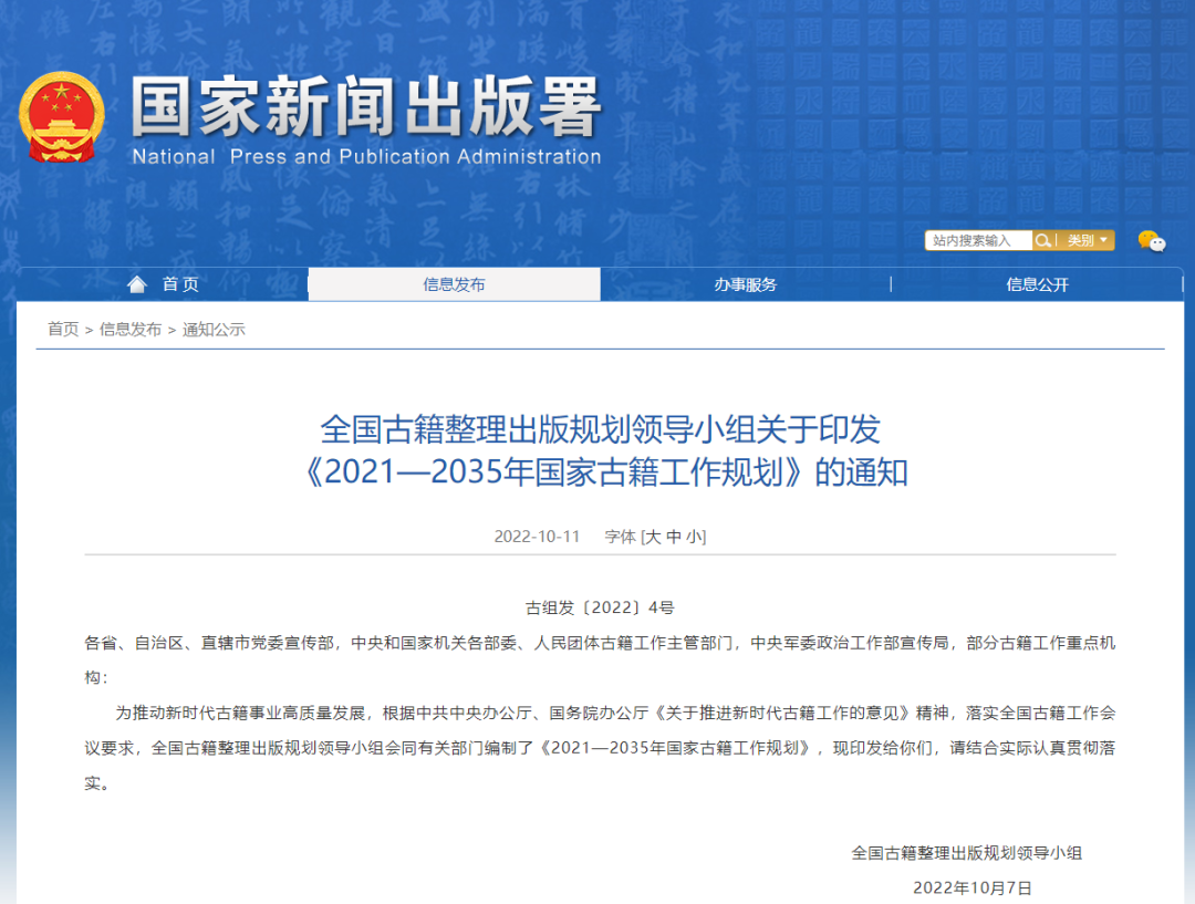 為推動新時代古籍事業高質量發展,根據中共中央辦公廳、國務院辦公廳《關于推進新時代古籍工作的意見》精神,落實全國古籍工作會議要求,全國古籍整理出版規劃領導小組會同有關部門編制了《2021—2035年國家古籍工作規劃》,現印發給你們,請結合實際認真貫徹落實。
