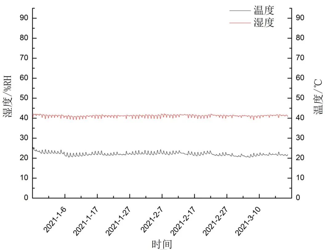 柜內配置了由天然植物纖維和高分子材料組成的恒濕模塊,并將濕度設定在適合古籍儲存的40%RH,根據無線溫濕度傳感器的數據顯示,在四個多月的時間內,兩臺儲藏柜內的濕度雖略有差異,但均在目標值的±5%以內,且穩定性極好。