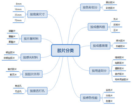 膠片的基材經過了“硝酸片 → 醋酸片 → 聚酯片(PET)”的發展過程,早期的片基是用硝酸纖維酯制造的,其成分與火藥棉近似,極易燃燒。目前,膠片市場上已經是聚酯片(PET)占據主流的局面。膠片的種類豐富,按照尺寸、片基材料、感光材料、感色性能等分為具有特色的膠片,具體如下: