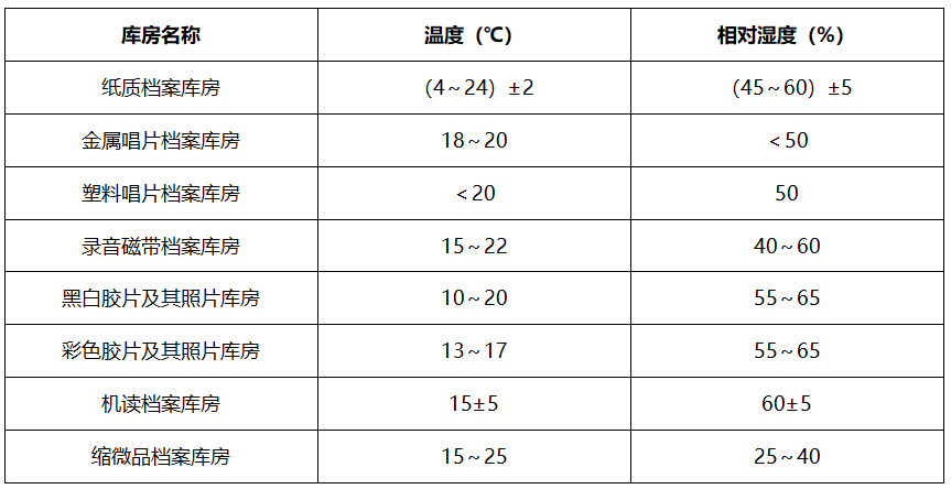 因此,膠片等文物存儲應嚴格控制儲存環境,我國及國外各類檔案庫房種類、溫度范圍及濕度控制范圍要求如下: