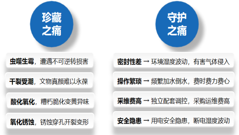 1.0時代,木質儲藏柜,以不同種類或類別的木頭制作,在其長期儲存過程中,自身釋放的有害氣體,以及受溫濕度、蟲霉、有害氣體等綜合影響,往往使文物面臨毀于一旦的風險;