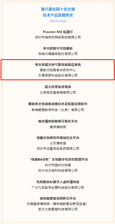 經(jīng)過終評(píng)委員會(huì)專家專業(yè)的評(píng)議討論,由國(guó)家文物局考古研究中心、天津森羅科技股份有限公司聯(lián)合申報(bào)的考古發(fā)掘文物氣密充氮脫鹽系統(tǒng),榮獲了第八屆全國(guó)十佳文博技術(shù)產(chǎn)品及服務(wù)獎(jiǎng)。常壓低氧氣調(diào)殺蟲系統(tǒng)。