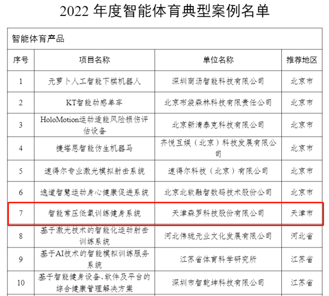 智能常壓低氧訓練健身系統入選2022年度智能體育典型案例