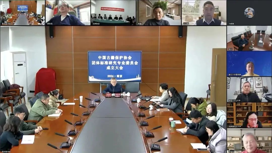 甲辰伊始,萬象更新。2月27日,中國古籍保護協會團體標準研究專業委員會成立大會暨第一次全體會議在掛靠單位南京圖書館順利召開。因受極端天氣影響,原計劃在現場召開的會議臨時改由線上舉行,經專委會全體委員共同努力,會議得以及時調整并實施到位,參會人員齊聚云端,在南京圖書館主會場和中國古籍保護協會秘書處分會場共襄盛舉。南圖和協會領導、團體標準研究專委會委員、南圖和協會秘書處相關工作人員30余人出席會議。會議由南京圖書館副館長陳立主持。