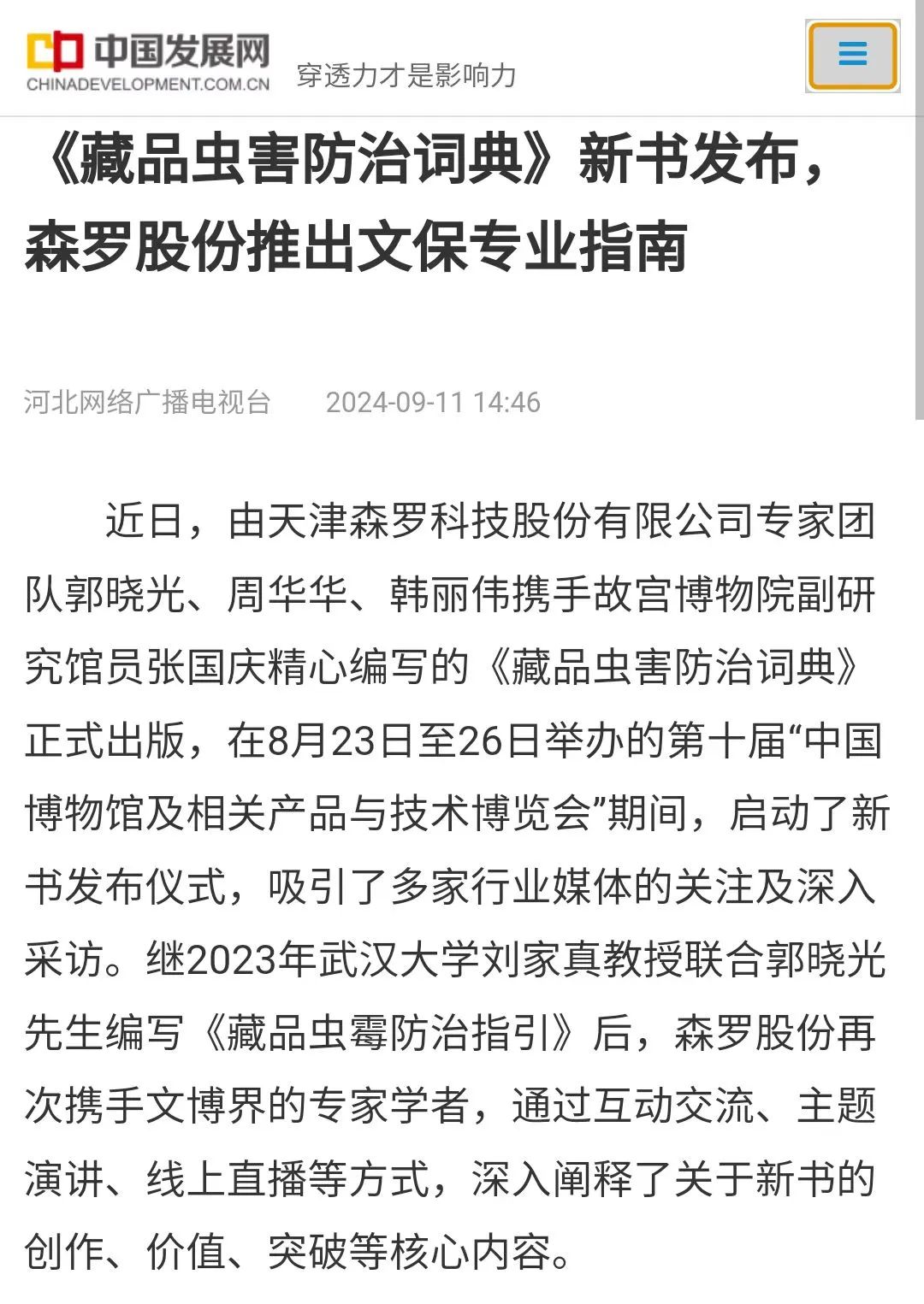 中國發展網、中華網、中宏網、鳳凰新聞、搜狐新聞、新浪財經、網易新聞、中國教育文化、環球教育資訊等百余家媒體對《藏品蟲害防治詞典》進行了專題報道。