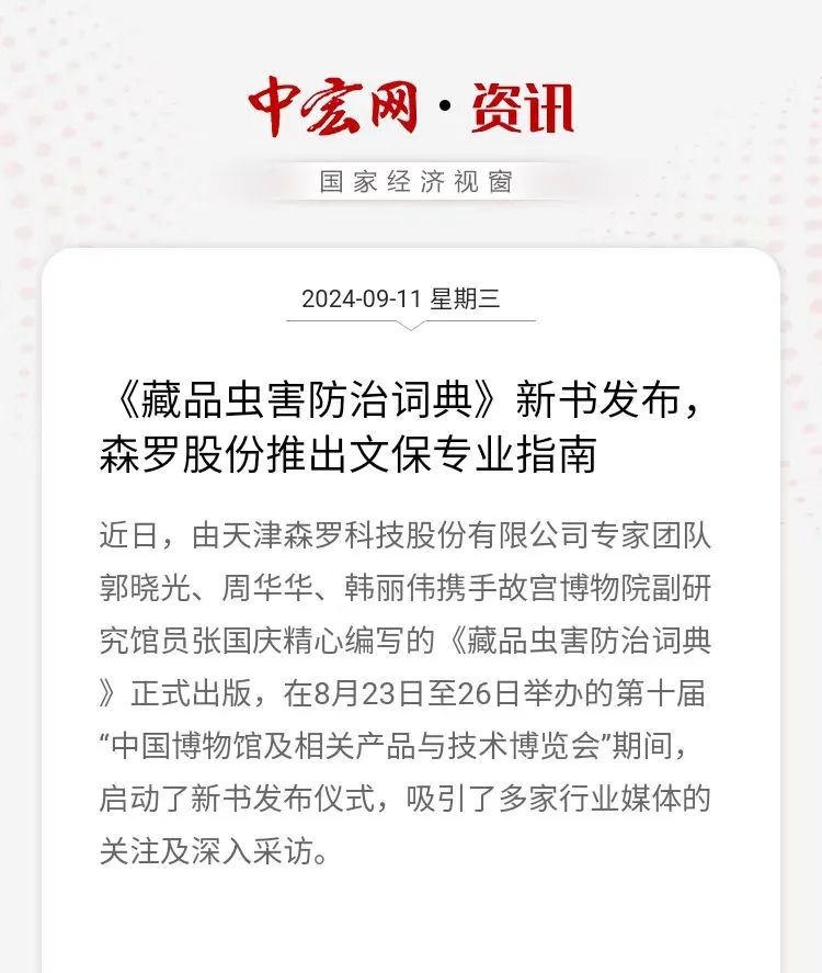 近日,由天津森羅科技股份有限公司專家團隊郭曉光、周華華、韓麗偉攜手故宮博物院副研究館員張國慶精心編著的《藏品蟲害防治詞典》正式出版,并于第十屆“博博會”期間舉辦了新書發布儀式。
