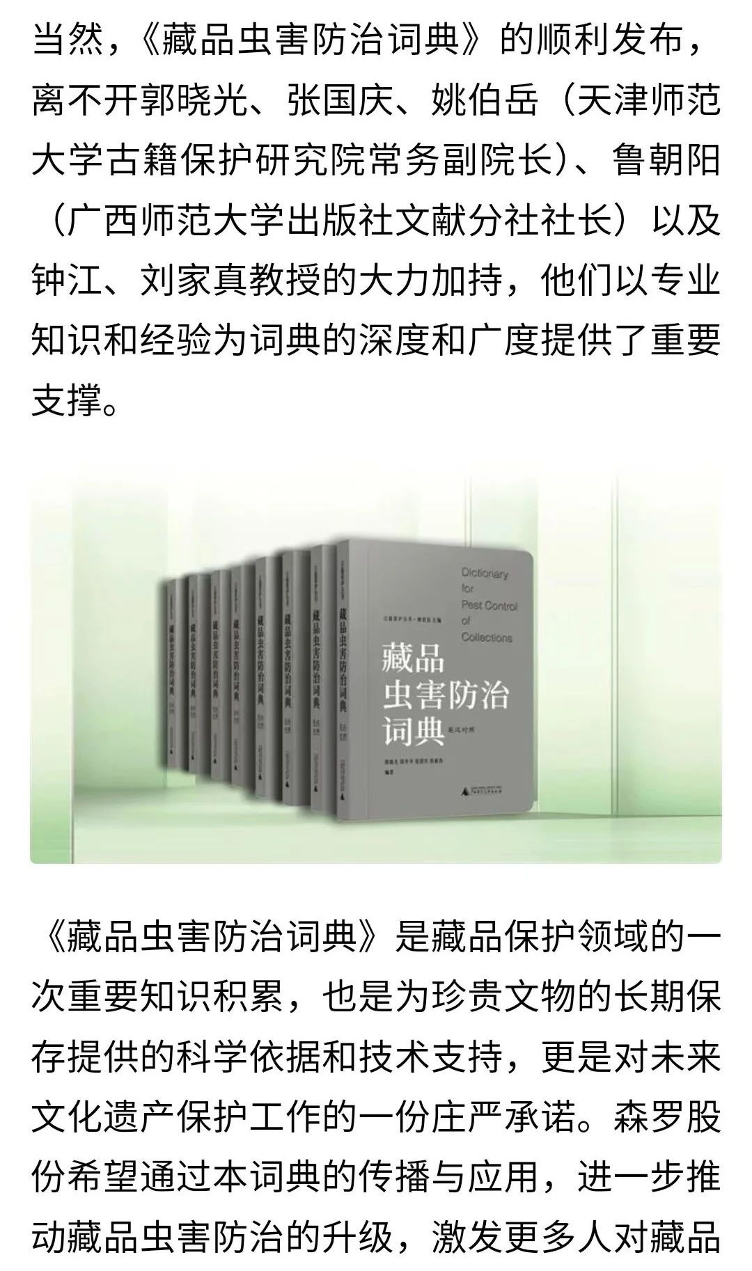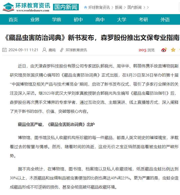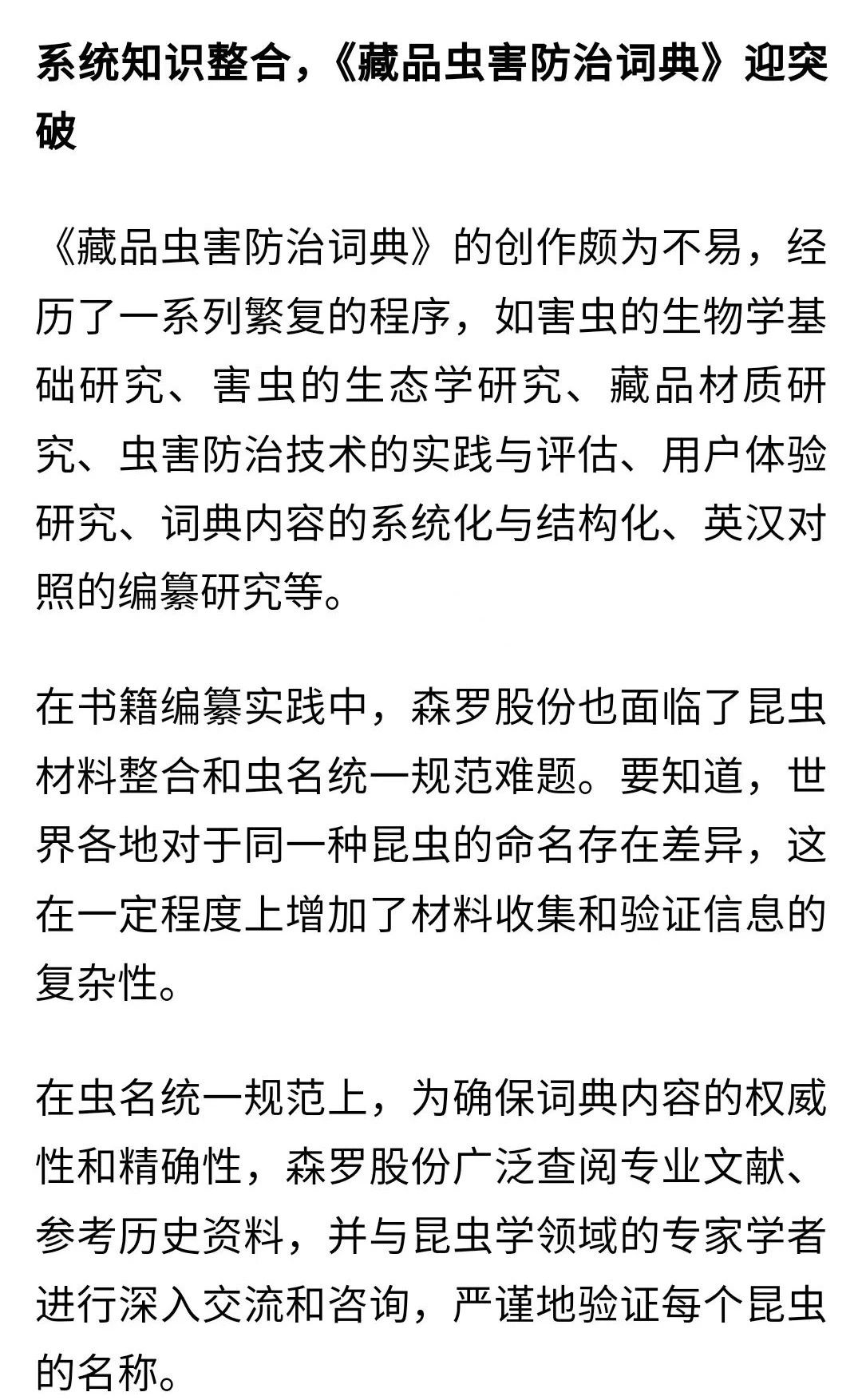 《藏品蟲害防治詞典》的問世,不僅填補了蟲害專業詞典領域的空白,更為全球藏品的保護交流與合作提供了重要的參考資源。這部詞典的出版與應用,標志著森羅股份在推動行業發展和學術研究方面的領先地位。未來,我們還將繼續與學術界、研究機構以及文博單位緊密合作,在藏品蟲害防治的新產品、新技術上投入更多力量;在技術突破與理論研究上不斷探索,不斷創新,為文化遺產的長久保存貢獻力量。