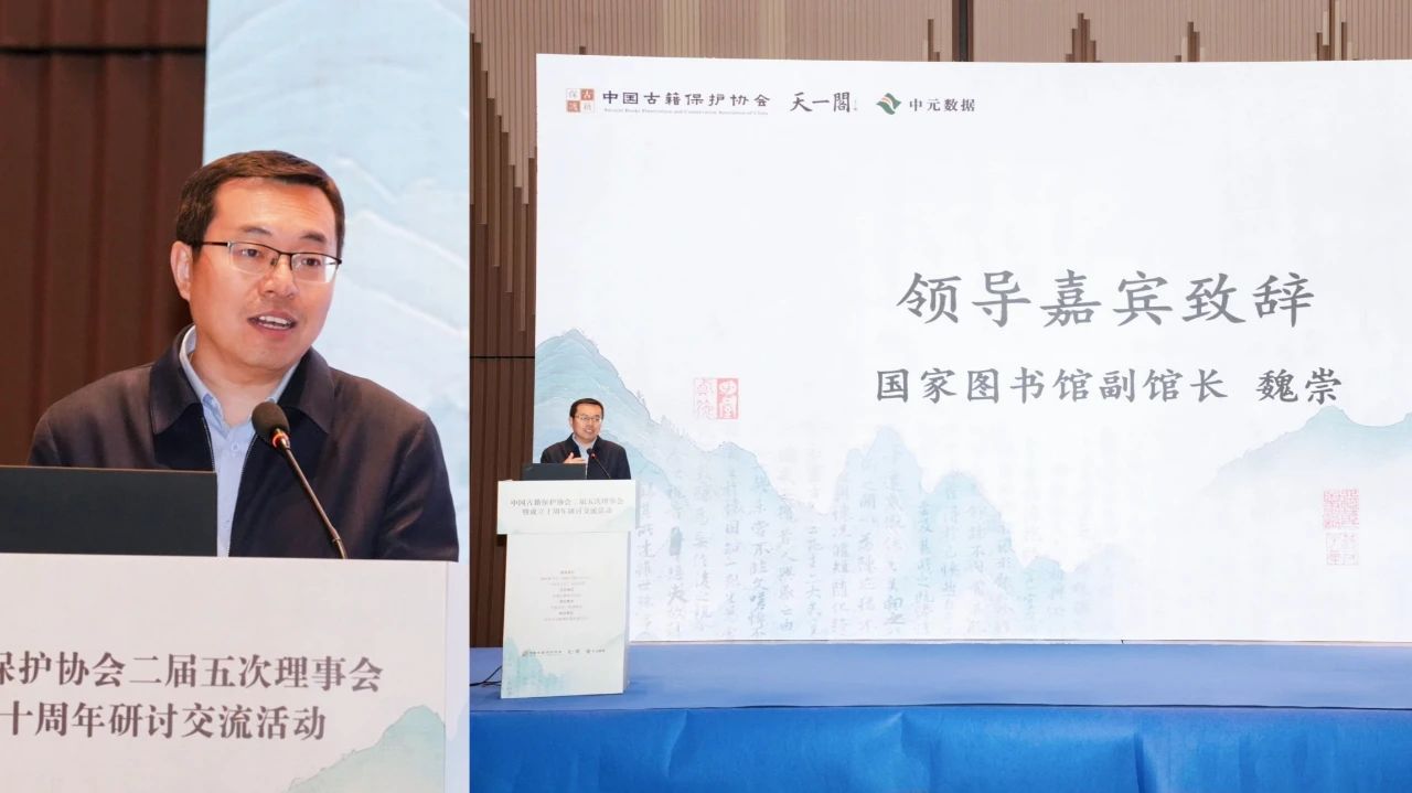 5月8日下午舉行的中國古籍保護協會成立十周年研討交流,是本次活動的重頭戲,由常務副會長張志清主持。今年,是中國古籍保護協會成立十周年,國家圖書館副館長魏崇在致辭中指出,協會的成立是古籍保護事業發展的重要里程碑。十年來,協會匯聚全國古籍收藏、保護修復、整理出版研究、數字化等領域的企事業單位和個人,緊密配合國家古籍保護中心,相互支撐、優勢互補,建成較為完整的全國古籍保護工作體系。希望協會繼續在立足職能定位筑牢發展根基、強化科技支撐引領改革創新方向、優化人才培養鍛造專業隊伍、深化行業協作構建多元參與機制等方面做好工作,以十年為嶄新起點,書寫中華典籍永續傳承的新篇章。