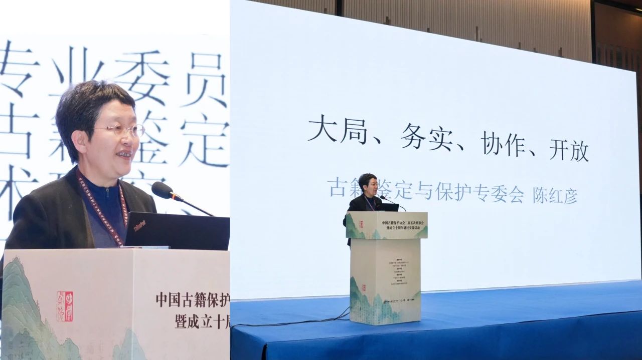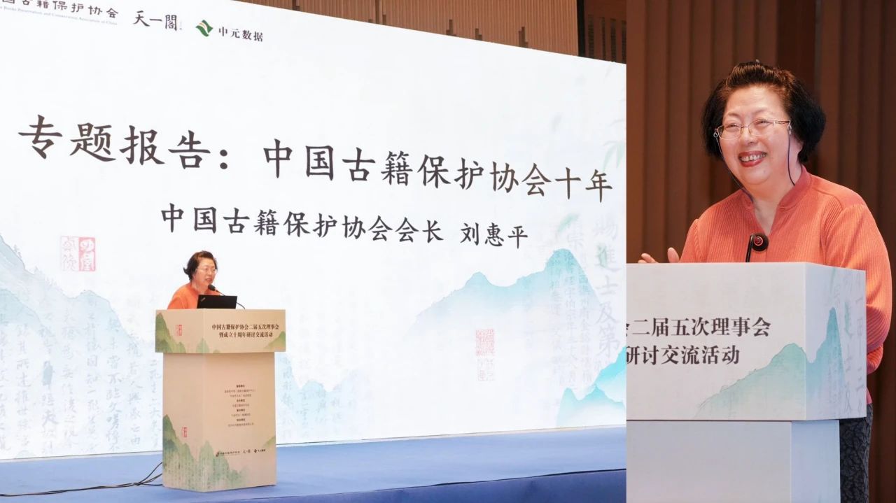 中國古籍保護協會會長劉惠平在會上作了題為《中國古籍保護協會的十年》的專題報告。她從“十年歷程回溯:凝聚行業共識,立足角色定位;十年實踐深耕:多措協同推進,成果顯著斐然;十年經驗總結:團結各方力量,勇于自我革新;面向未來十年:開啟創新篇章,探索融合路徑”四個方面深情回顧了中國古籍保護協會成立十年來的發展歷程,介紹了主要成績、經驗總結和發展愿景。她指出,作為政府與行業之間的橋梁紐帶,協會要在未來發展中,繼續秉持定位,努力充當好社會力量整合者、宣傳推廣倡導者、行業自律監督者、服務平臺搭建者角色,與國家古籍保護中心、文化科研機構、高校、企業、民間古籍保護者形成合力,推動國家古籍保護事業踏上新的臺階。