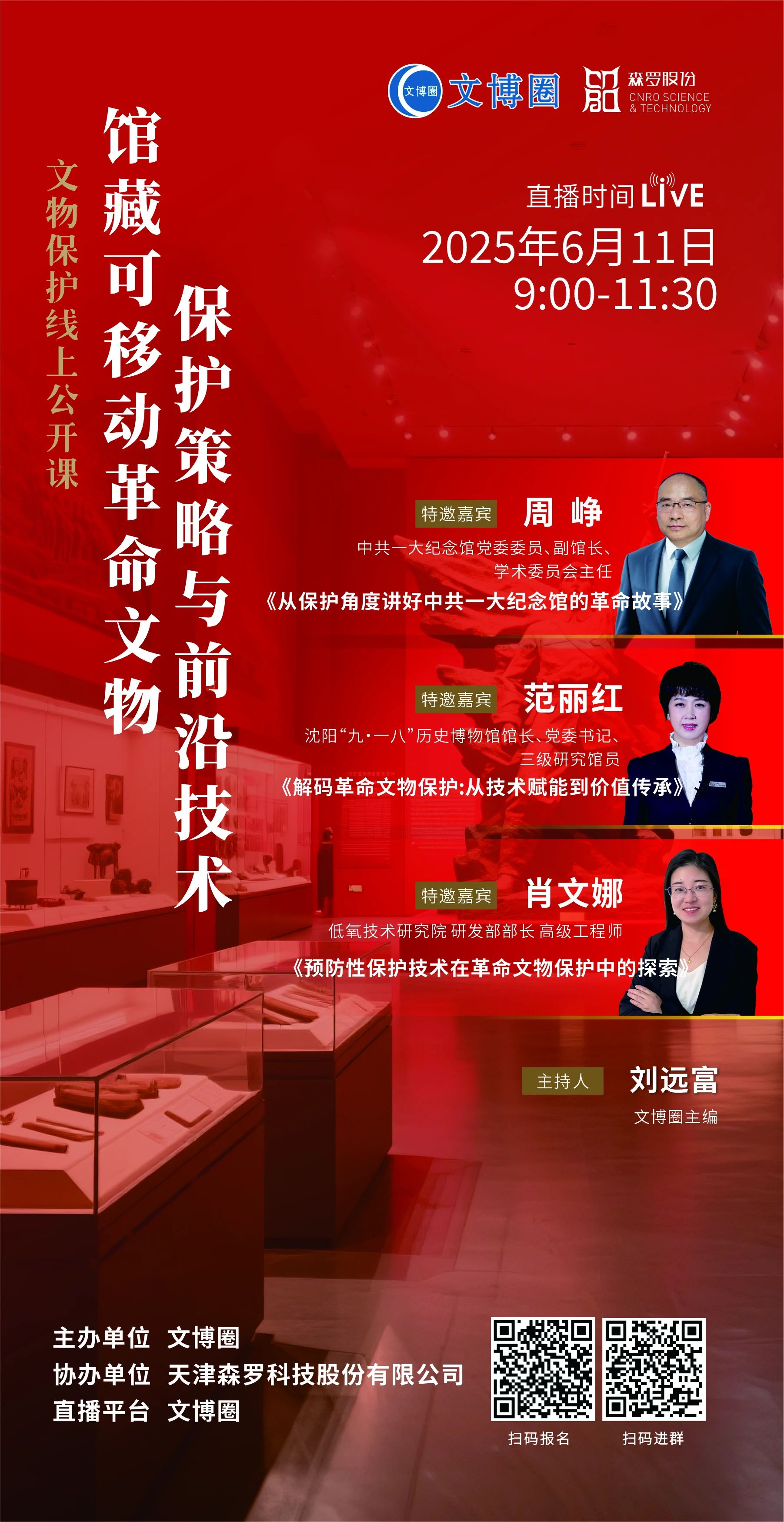 本期公開課直播,邀請到了相關領域專家學者,圍繞館藏可移動革命文物保護的主題,精準剖析革命文物保存現狀與關鍵痛點,系統講解前沿保護技術與儲存方案,共同探討預防性保護體系構建與可持續發展機制,為觀眾帶來一場干貨滿滿的學術盛宴。除主題演講外,還設置參與抽獎、互動沙龍等多個環節,促進思想的碰撞與靈感的激發。