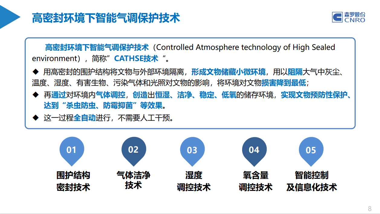“CATHSE技術(shù)”是森羅股份在長(zhǎng)期的研究與摸索中,形成的一套專(zhuān)有的高密閉環(huán)境下智能低氧氣體調(diào)控技術(shù)體系,可廣泛應(yīng)用于考古發(fā)掘、藏品長(zhǎng)期儲(chǔ)藏、展覽展示、蟲(chóng)霉防治與服務(wù)等領(lǐng)域。